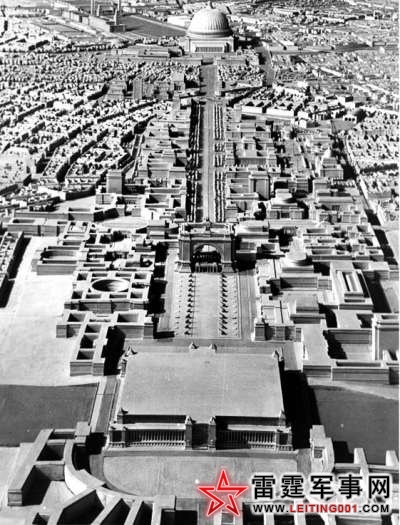 这便是法西斯德国的新首都——“日耳曼尼亚”。方案公开后,不仅得到了纳粹御用文人的大肆吹捧,一些外国主流媒体也对它表现出浓厚兴趣,美国《纽约时报》将其形容为“或许是现代世界最雄伟的规划设计”。据说,当施佩尔同样身为建筑师的父亲见到蓝图上的“日耳曼尼亚”时,震惊之余吐出的头一句话是:“你完全疯了。”